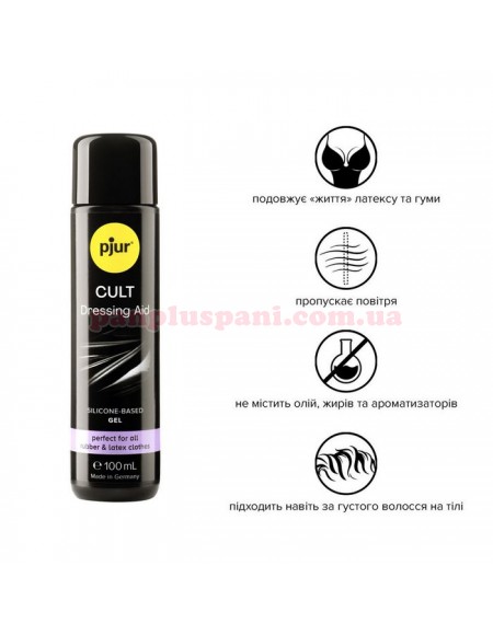 Лубрикант для латексу та гуми pjur Cult Dressing Aid допоможе легко вдягнути будь-який найвужчий одяг. Він має пом’якшувальну суперслизьку формулу з силіконовими полімерами, які роблять латексне полотно та гуму м’якими, гладенькими та більш гнучкими. Завдяки цьому речі з таких примхливих матеріалів стають податливими і краще ковзають по шкірі. Перешкодою не стане навіть рясна рослинність на тілі!