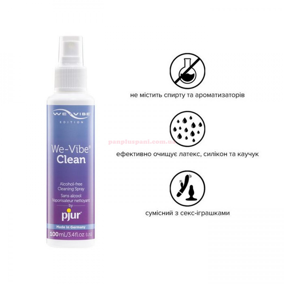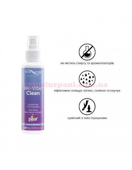 Очищуючий спрей pjur We-Vibe Clean спеціально розроблений для делікатного та гігієнічного догляду за іграшками для дорослих.всіх продуктів We-Vibe. Не містить спирту та ароматизаторів. Не має вираженого запаху, пройшов дерматологічний контроль та є абсолютно безпечним продуктом для вашого здоров’я. Підходить для використання з делікатними матеріалами, такими як латекс, силікон, каучук.