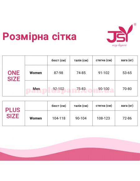Розмір: S/M, груди 87 - 89 см, талія 74 - 85 см, стегна 91 - 102 см, на вагу 53 - 65 кг.