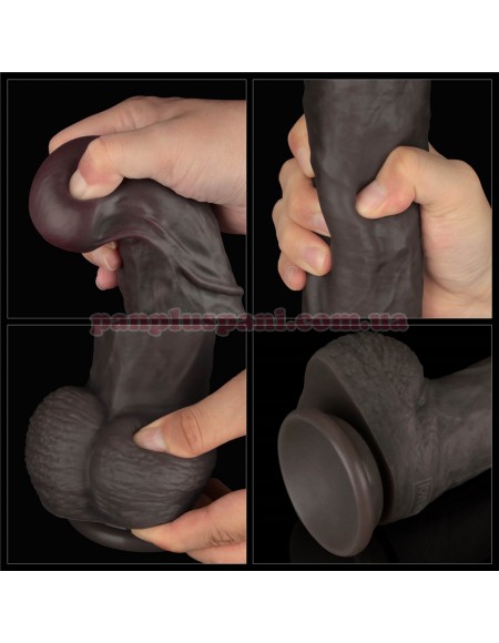 Всередині він щільний - як при гарній ерекції, головка еластична, пружна і в міру м'яка. Це створює вражаючий ефект реалістичності. Завдяки потужній присосці модель надійно фіксується на будь-якій гладкій поверхні. Виготовлений з преміального двошарового рідкого силікону, приємного на дотик. Великий розмір забезпечить відчуття заповнення і стимуляцію в найчутливіших точках. Для більшої реалістичності можна подігріти в теплій воді.