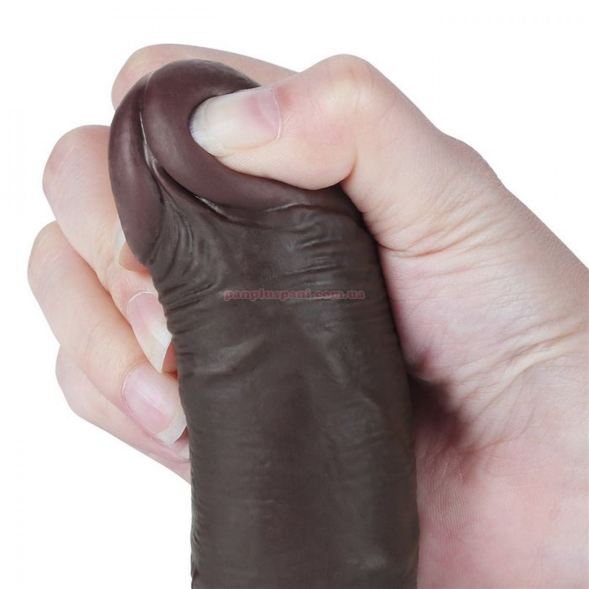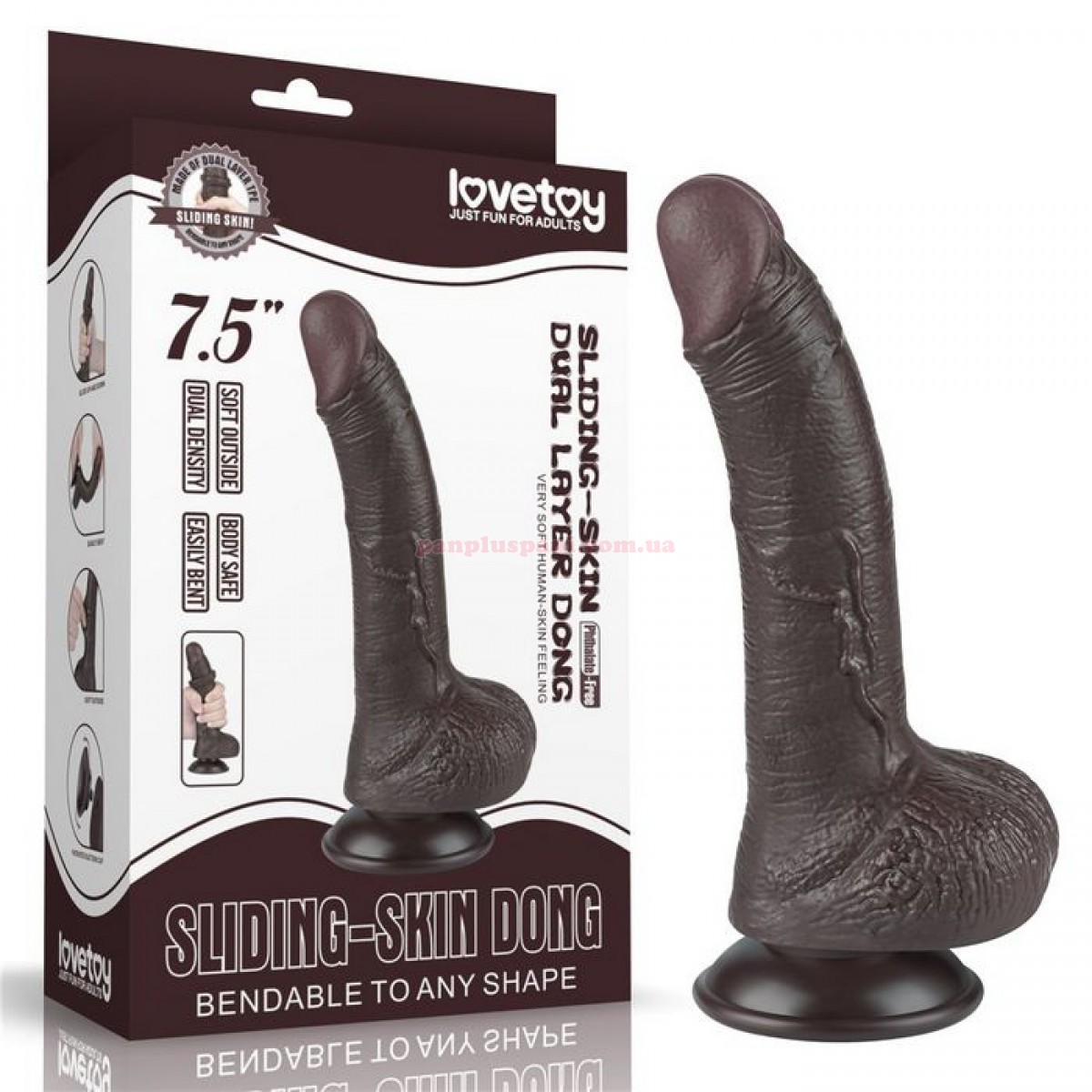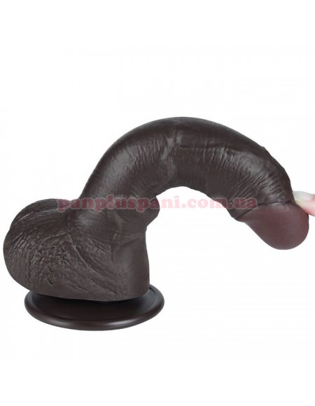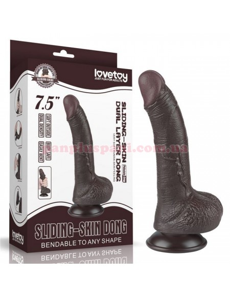 Фалоімітатор Sliding Skin Dual Layer Dong створений для тих, кому подобаються темношкірі хлопці з середнім розміром члена. Має реалістичний вигляд, велику головку, загнутий стовбур з імітацією пульсуючої венозної сітки і рельєфну мошонку. Стовбур має кут нахилу для найкращої стимуляції зони "G". Виготовлений з м'якого та еластичного матеріалу ТПЕ (термопластичний еластомер), приємного на дотик. Технологія двошарового ковзаючого покриття дає відчуття рухомого верхнього м'якого шару, який можна рухати відносно більш щільного внутрішнього. Це створює вражаючий ефект реалістичності. Завдяки знімній потужній присосці його можна надійно зафіксувати на будь-якій гладкій поверхні і використовувати без рук. Розмір забезпечить незабутнє відчуття заповнення і стимуляцію в найчутливіших точках. Для більшої реалістичності можна подігріти в теплій воді.