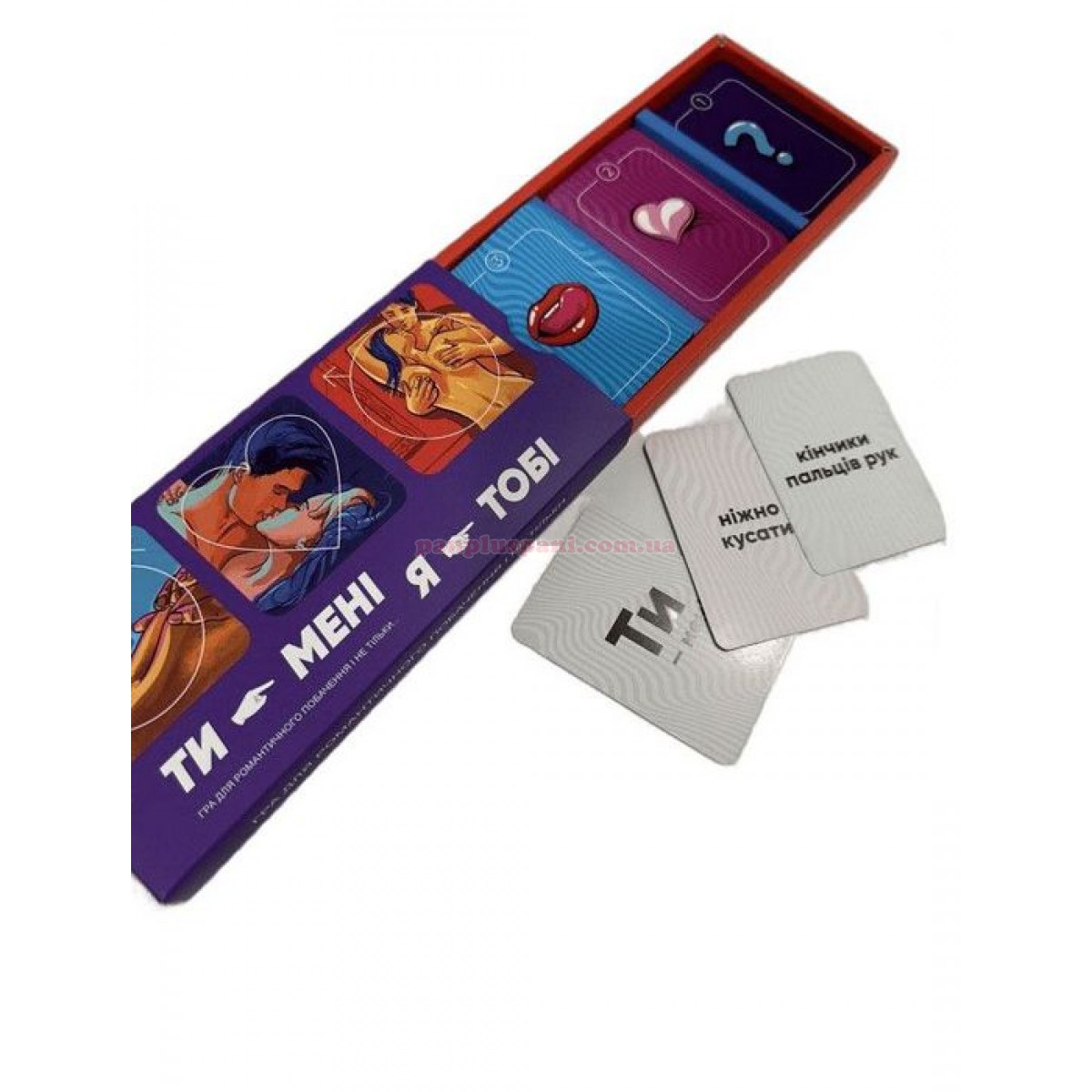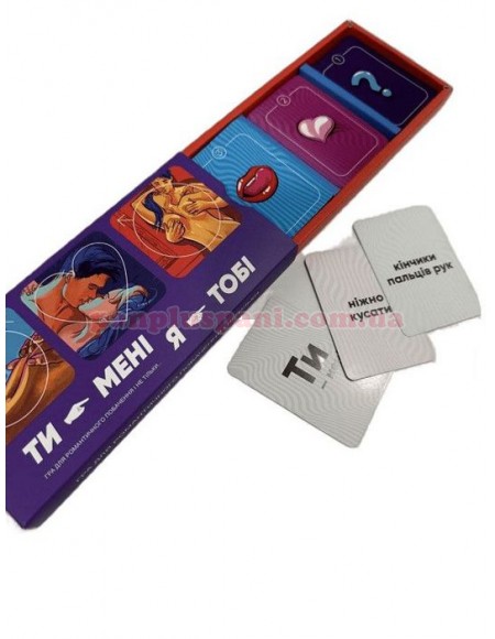 Опис: "Ти – мені, я – тобі" сподобається парам на самому початку відносин, коли кожен дотик відчувається особливо гаряче, і давнім партнерам, які хочуть трохи урізноманітнити інтимне життя. Відкладіть телефони, відключіть інтернет та приготуйтеся до незабутньої пригоди! У цій грі ви будете гладити, стискати, покусувати і лоскотати найнесподіваніші (і, звичайно, приємні) місця, адже все вирішує випадок! У коробці ви знайдете 3 колоди карт. Карта з першої колоди визначає хто виконуватиме завдання, з другої - що потрібно зробити, а з третьої - з якою частиною тіла. Може випасти щось неймовірно ніжне, наприклад, «лоскотати язиком плечі», а може і щось кумедне на кшталт «посмоктувати коліно», то ж гра не буде нудною! До того ж цікаві комбінації, які підкаже вам еротична гра «Ти – мені, я – тобі», цілком можуть у майбутньому стати вашими улюбленими пестощами, тому - вперед до експериментів та несподіваних відчуттів!