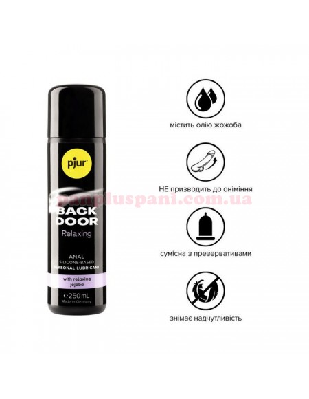 Лубрикант Pjur Back Door Relaxing - густа силіконова гель-змазка з екстрактом жожоба, спеціально розроблена для інтенсивного анального сексу. Порівняно з лубрикантом Analyse Me! Relaxing в гелі Back Door Relaxing вища концентрація інгридієнтів і він орієнтований на максимальне ковзання, сміливі анальні ігри та використання великих іграшок.