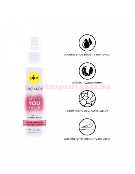 Спрей після гоління Pjur Woman After you shave зволожує та захищає шкіру від подразнення. Формула з пантенолом має протизапальну та регенеруючу дію. Дозатор з розпилювачем дозволяє зручно та економно використовувати лосьйон. Просто розпорошіть його на шкіру після гоління і насолоджуйтесь гладкістю та комфортом!