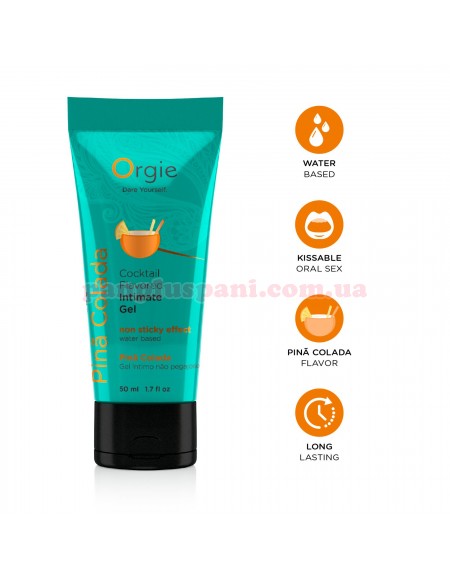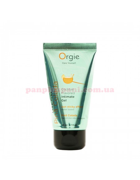 Лубрикант Orgie Lube Tube Cocktail Pina Colada - їстівна інтимна змазка на водній основі з коктейльної серії лубрикантів Orgie. Уявіть, що клубна вечірка з коктейлями відбувається у вашому ліжку і тільки для вас! Приємний смак гелю додає апетиту до оральних пестощів. Збалансована формула з гліцерином, касторовою олією та молочною кислотою забезпечує тривале зволоження, комфортне ковзання і підтримку природнього рівня pH. Лубрикант Orgie Lube Tube Cocktail підходить для орального та вагінального сексу. Насолоджуйтеся новим смаком вашого задоволення!