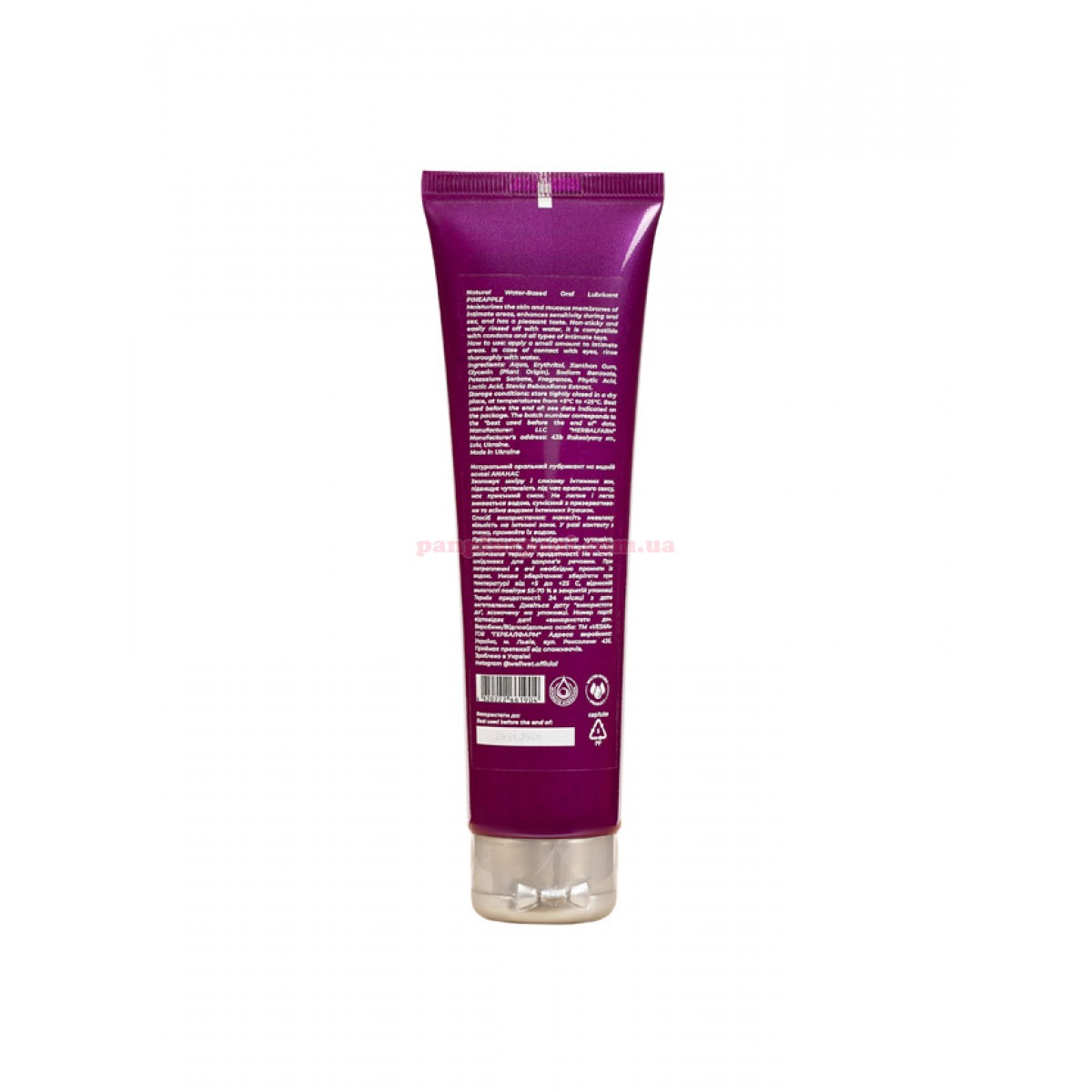 Легкий ананасовий смак розбудить апетит до оральних пестощів і чудово доповнить задоволення від близькості. Завдяки збалансованій формулі з рослинним гліцерином інтенсивно зволожує шкіру та слизову, забезпечує м’який догляд та тривале ковзання. Містить молочну кислоту, що сприяє підтримці здорового мікробіому інтимної зони, та натуральні консерванти (натрій бензоат, сорбат калію).