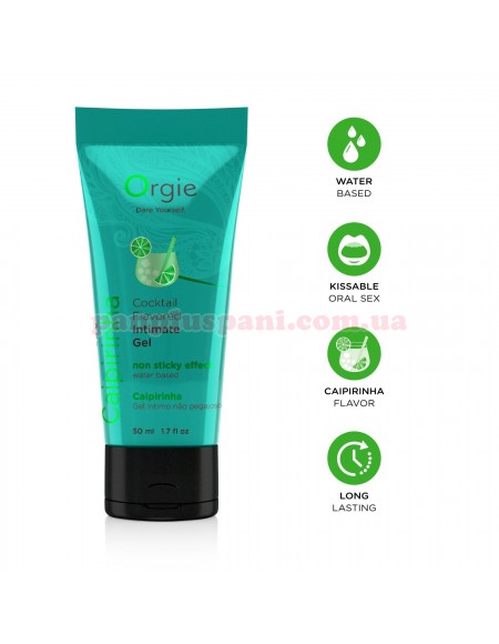 Лубрикант Orgie Lube Tube Cocktail Caipirinha - їстівна інтимна змазка на водній основі з коктейльної серії лубрикантів Orgie. Уявіть, що клубна вечірка з коктейлями відбувається у вашому ліжку і тільки для вас! Приємний смак гелю додає апетиту до оральних пестощів. Збалансована формула з гліцерином, касторовою олією та молочною кислотою забезпечує тривале зволоження, комфортне ковзання і підтримку природнього рівня pH. Лубрикант Orgie Lube Tube Cocktail підходить для орального та вагінального сексу. Насолоджуйтеся новим смаком вашого задоволення!