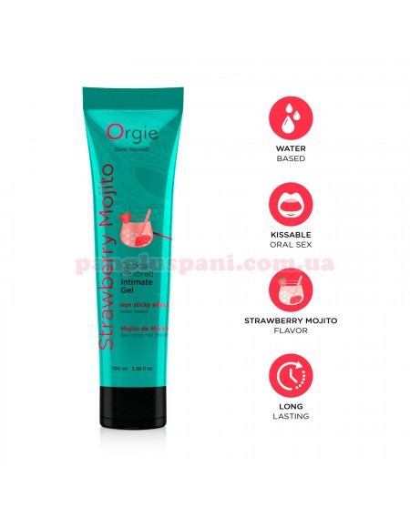 Лубрикант Orgie Lube Tube Cocktail Strawberry Mojito - їстівна інтимна змазка на водній основі з коктейльної серії лубрикантів Orgie. Уявіть, що клубна вечірка з коктейлями відбувається у вашому ліжку і тільки для вас! Приємний смак гелю додає апетиту до оральних пестощів. Збалансована формула з гліцерином, касторовою олією та молочною кислотою забезпечує тривале зволоження, комфортне ковзання і підтримку природнього рівня pH. Лубрикант Orgie Lube Tube Cocktail підходить для орального та вагінального сексу. Насолоджуйтеся новим смаком вашого задоволення!