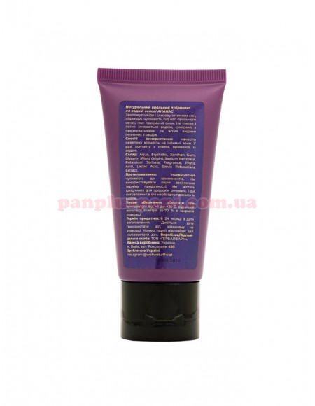 Легкий ананасовий смак розбудить апетит до оральних пестощів і чудово доповнить задоволення від близькості. Завдяки збалансованій формулі з рослинним гліцерином інтенсивно зволожує шкіру та слизову, забезпечує м’який догляд та тривале ковзання. Містить молочну кислоту, що сприяє підтримці здорового мікробіому інтимної зони, та натуральні консерванти (натрій бензоат, сорбат калію).