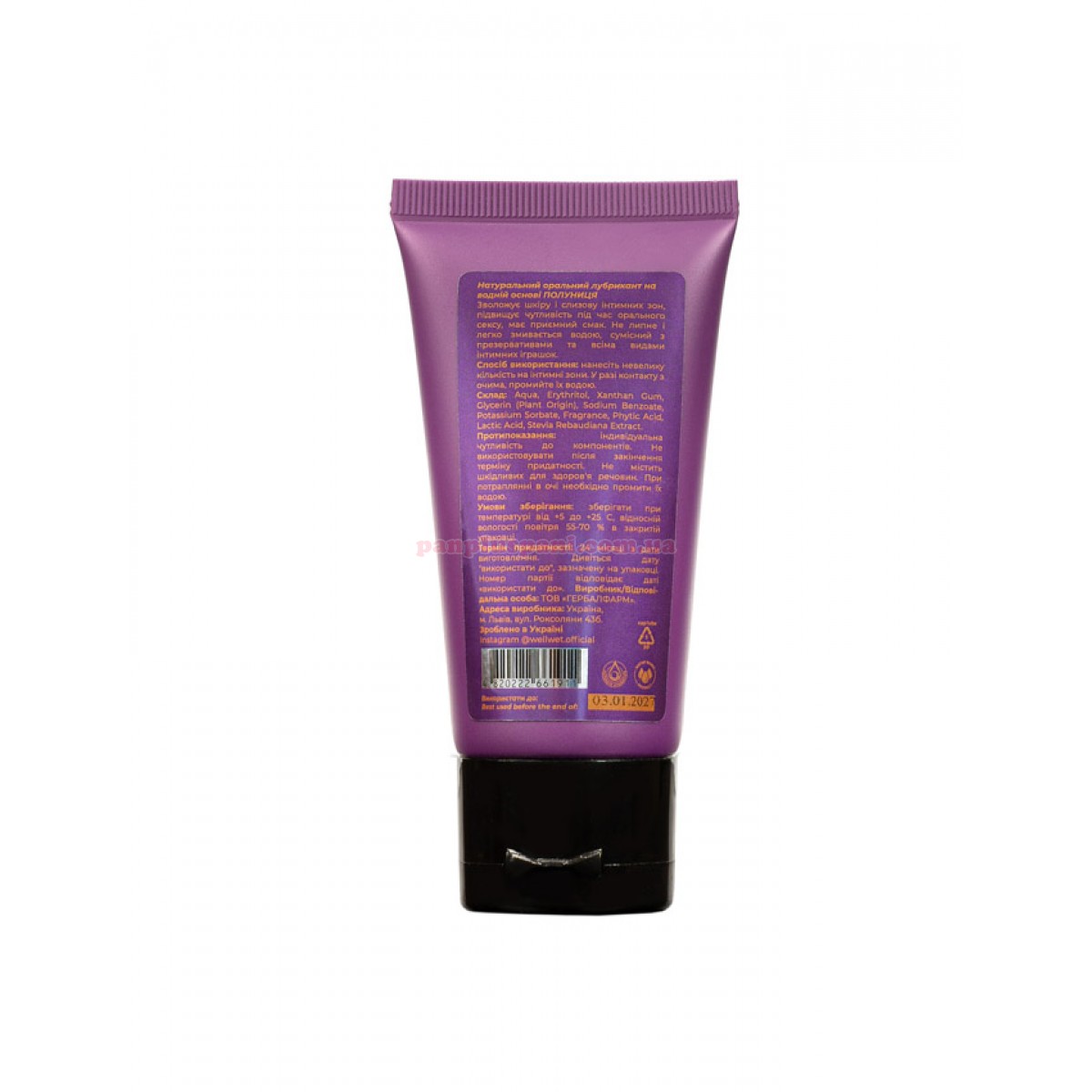 Легкий смак полуниці розбудить апетит до оральних пестощів і чудово доповнить задоволення від близькості. Завдяки збалансованій формулі з рослинним гліцерином інтенсивно зволожує шкіру та слизову, забезпечує м’який догляд та тривале ковзання. Містить молочну кислоту, що сприяє підтримці здорового мікробіому інтимної зони, та натуральні консерванти (натрій бензоат, сорбат калію).