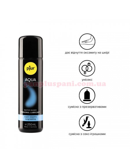 Лубрикант Pjur Aqua - змазка на водній основі преміум-якості для чистої насолоди! Чудово підходить для щоденного сексу та регулярного догляду за тілом - завжди зволожує, захищає від натирання та залишає тільки приємні відчуття.
