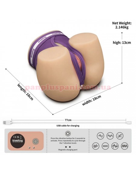 Розміри: 18 x 18,5 x 14 см, глибина каналу вагіни - 11 см, глибина каналу ануса - 10 см, Ø каналів - 1 см (еластичні), вага 2146 г.