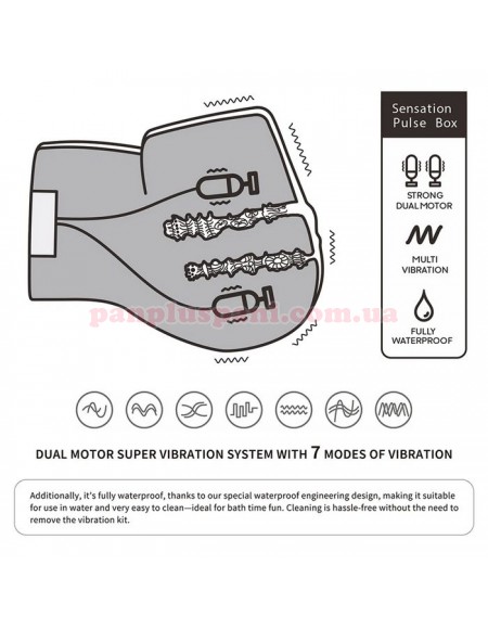 Іграшка оснащена революційною системою Sensation Pulse Box і точно сподобається тим, хто прагне глибокого задоволення та реалістичного досвіду. Система складається з двох віброелементів, розташованих поруч з каналами. Їх вібруючий вплив стане приємним стимулючим доповненням до реалістичного внутрішнього рельєфа каналів і створить відчуття контакту з справжнім жіночим тілом. Оберіть з якого отвору почати і нанесіть достатню кількість змазки. Скориставшись вагіною можна повторити задоволення з пружною попкою або навпаки. Мотори створюють 7 режимів вібрації, працюють одночасно і мають єдину кнопку керування на спеціальній панелі. Системи подвійної вібрації зробить набагато приємнішим кожне використання, додасть нових різноманітних відчуттів, та задовольнить ваші бажання.