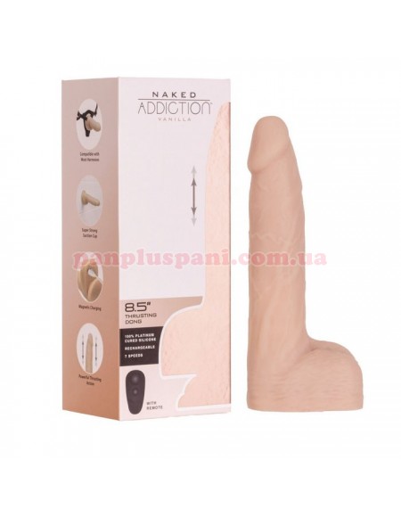 Пульсатор Naked Addiction Thruster здійснює поштовхи та зворотно-поступальні рухи різної сили без допомоги рук, імітуючи фрикції, і забезпечує вражаюче реалістичні відчуття. Для зручності використання додатково оснащений пультом дистанційного керування. Має зовнішній вигляд статевого органу відчутних розмірів з м'якою та пружною головкою, потужним негнучким рельєфним стовбуром та текстурованою мошонкою. Завдяки надійній присосці його можна міцно зафіксувати на будь-якій гладкій поверхні. Виготовлений із запатентованого силікону преміальної якості Incredifeel™, який має високу міцність на розрив, не жовтіє та не містить побічних продуктів перекису. Дуже ніжний на дотик і абсолютно безпечний, більш міцний, пружний та зносостійкий, ніж звичайний силікон. Можливість передати пульт керування іграшкою партнеру відкриває простір для збуджуючої гри.