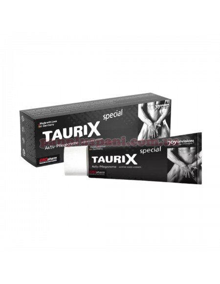 Крем TauriX – стимулюючий засіб для покращення кровообігу в інтимній зоні та дбайливого догляду за ніжною шкірою пеніса та яєчок. Активні косметичні компоненти та натуральні рослинні інгредієнти - масло ши, солодкого мигдалю, какао, таурин, токоферол та екстракти муіра пуама і женьшеню - живлять вашу шкіру та проникають в тканини, надають еластичності та стимулюють кровообіг для найкращих відчуттів під час близькості. Завдяки комплексній дії крему в поєднанні з масажним впливом при його нанесенні ви отримаєте якісну ерекцію та максимум задоволення від сексу.